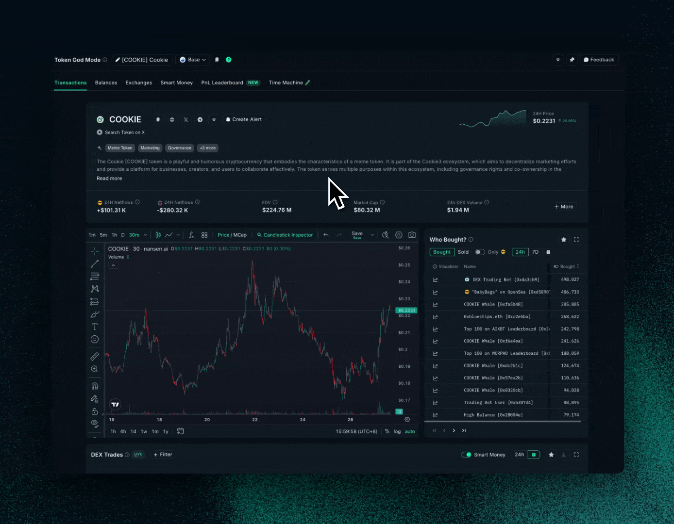 Click any candle to instantly reveal all trades within that timeframe. Your transaction tables update automatically, giving you real-time insights into price movements.